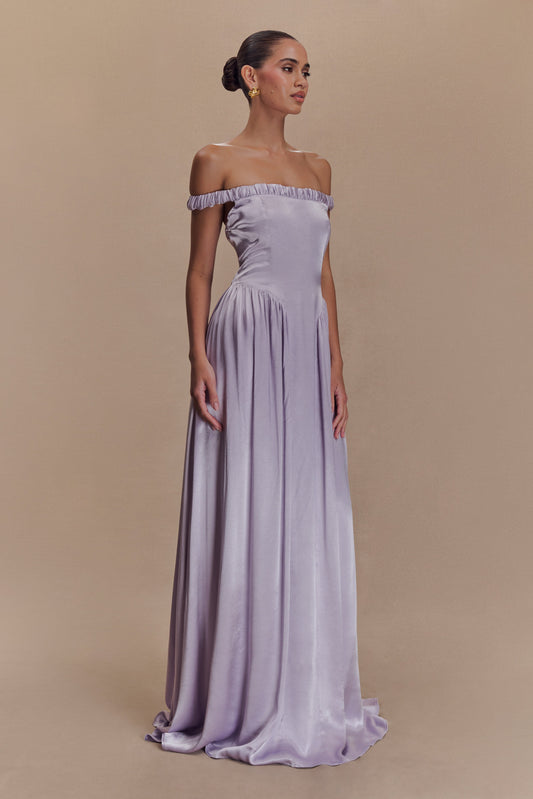 ROF Dalia Düşük Omuz Saten Maxi Elbise - Buzlu Mavi