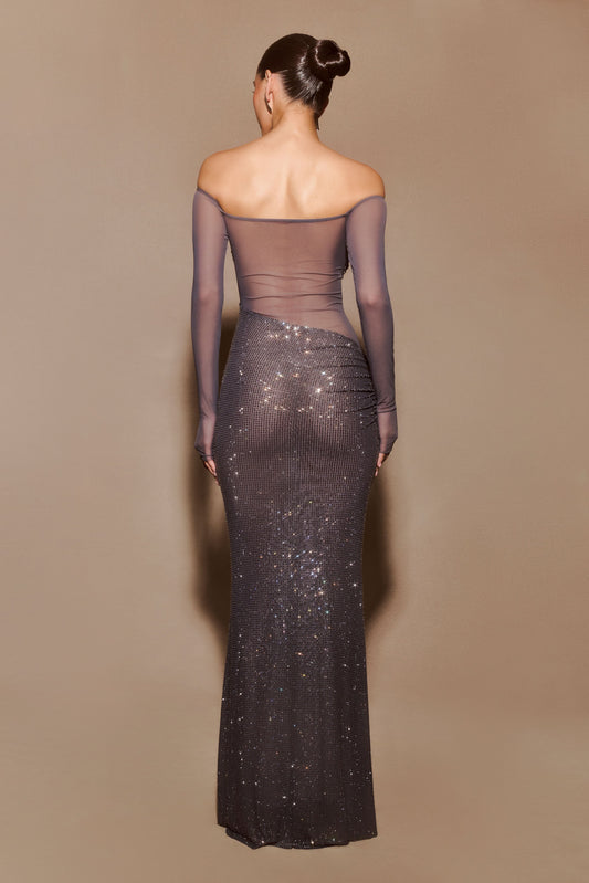 ROF Nash Diamante Düşük Omuz Uzun Elbise - Tunç Metal