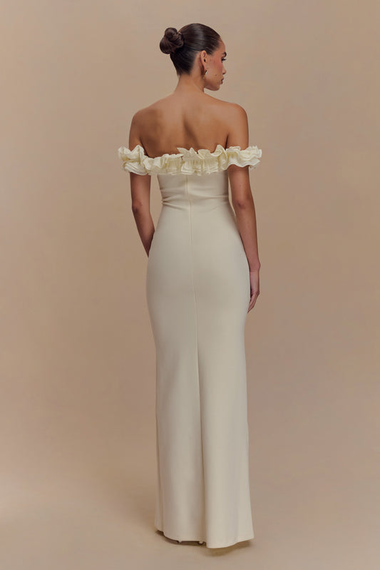 ROF Nova Fırfırlı Düşük Omuz Uzun Elbise - Fildişi