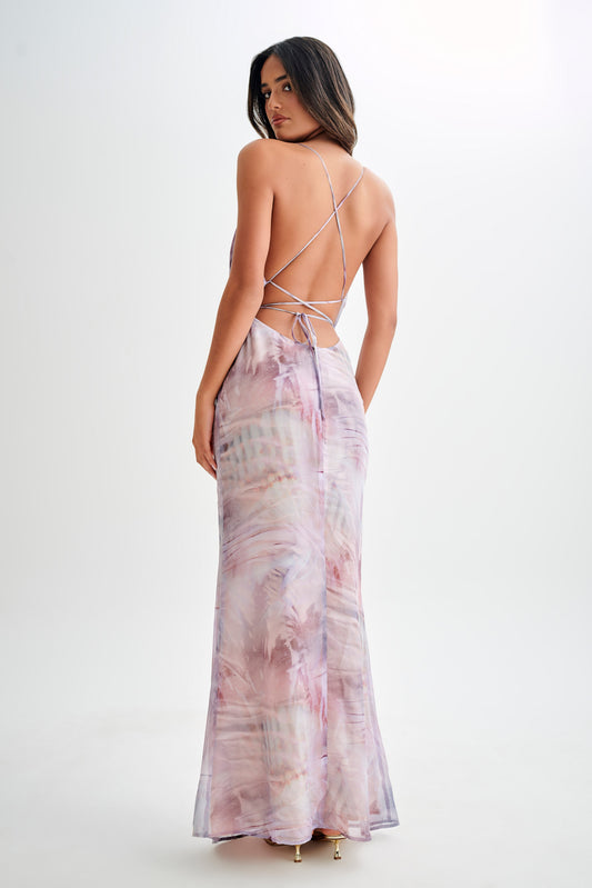 ROF Attina Kukuletası Şifon Maxi Elbise - Denizkızı Kabuğu Baskı