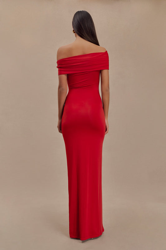 ROF Cassandra Düşük Omuzlu Dar Uzun Elbise - Kırmızı