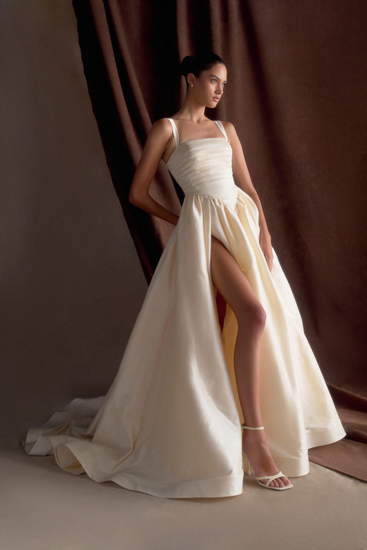 ROF Claire Mat Saten Drape Sırtlı Uzun Elbise - Açık Sarı