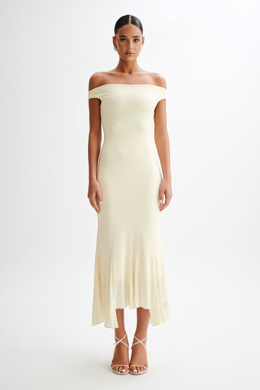 ROF Arielle Düşük Omuz Fırfırlı Midi Elbise - Pastel Limon