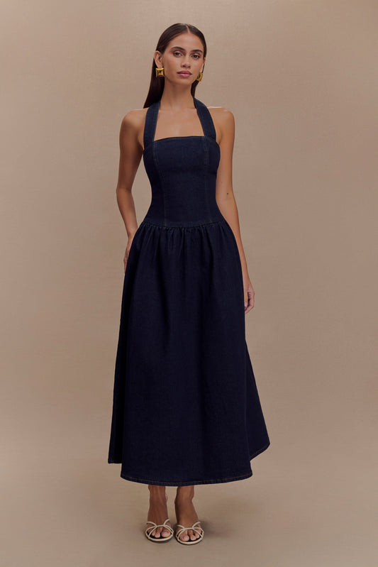 ROF Caroline Denim Boyundan Bağlamalı Midi Elbise - İndigo Mavi