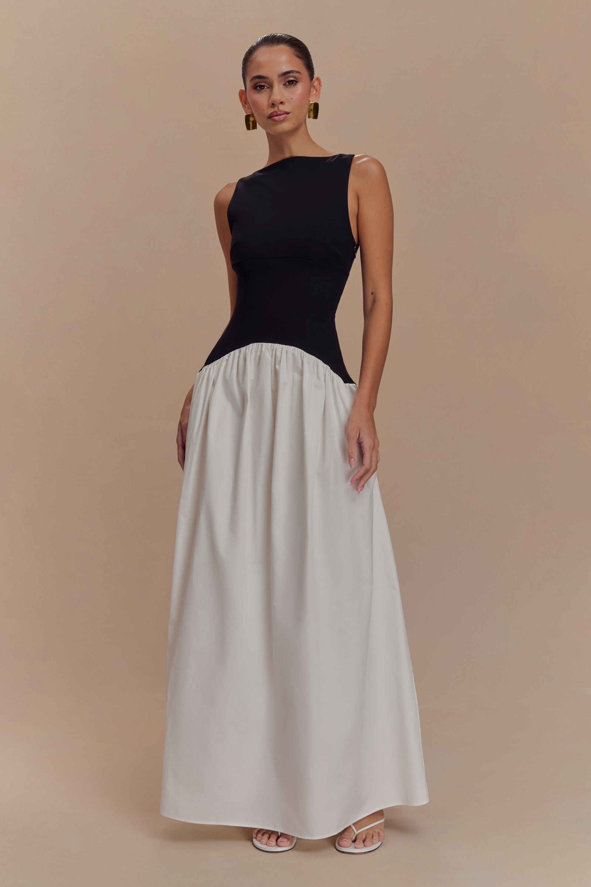ROF Akasya Kontrast Kolsuz Uzun Elbise - Siyah/Beyaz