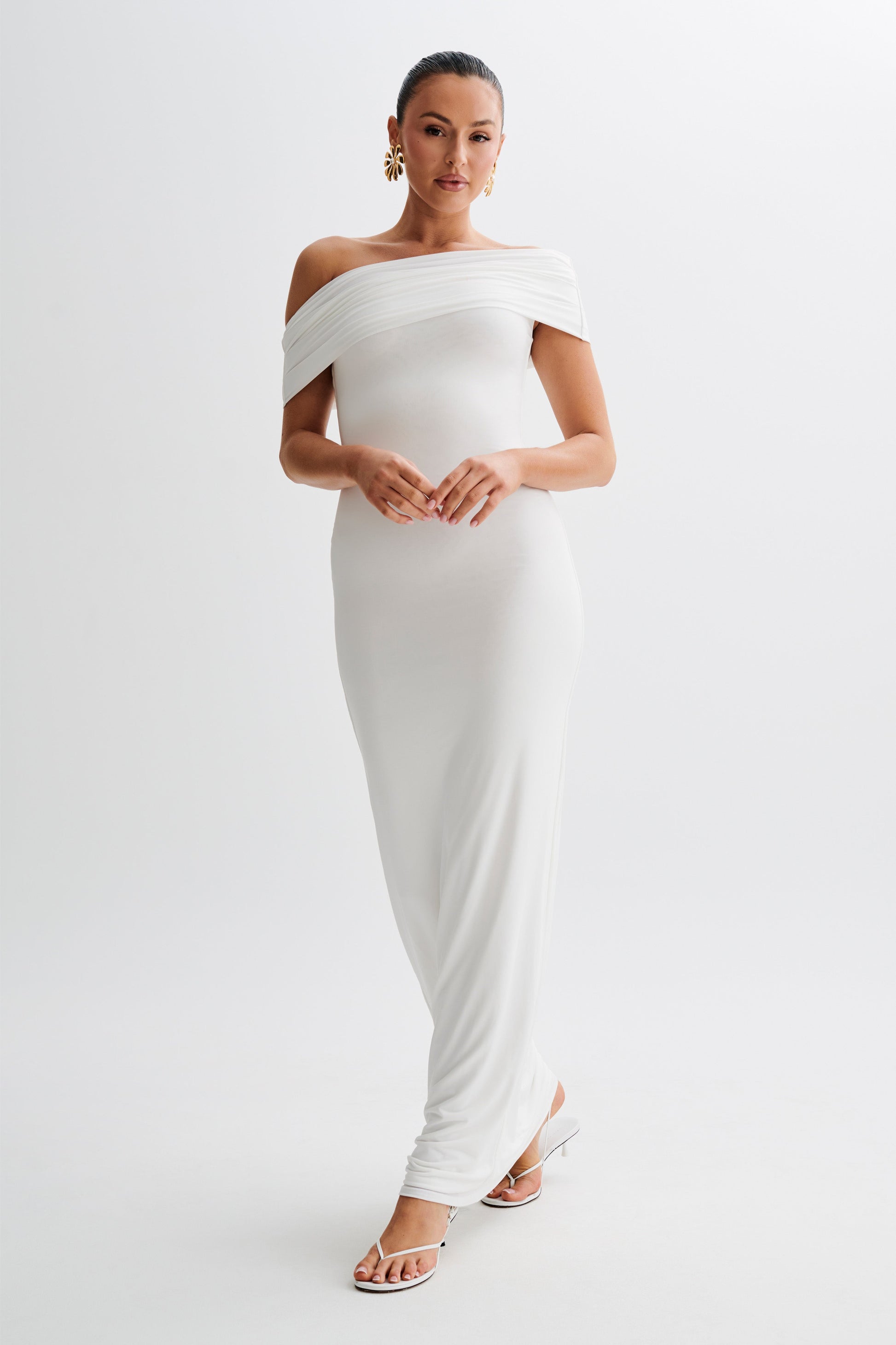 ROF Cassandra Düşük Omuzlu Dar Uzun Elbise - Beyaz