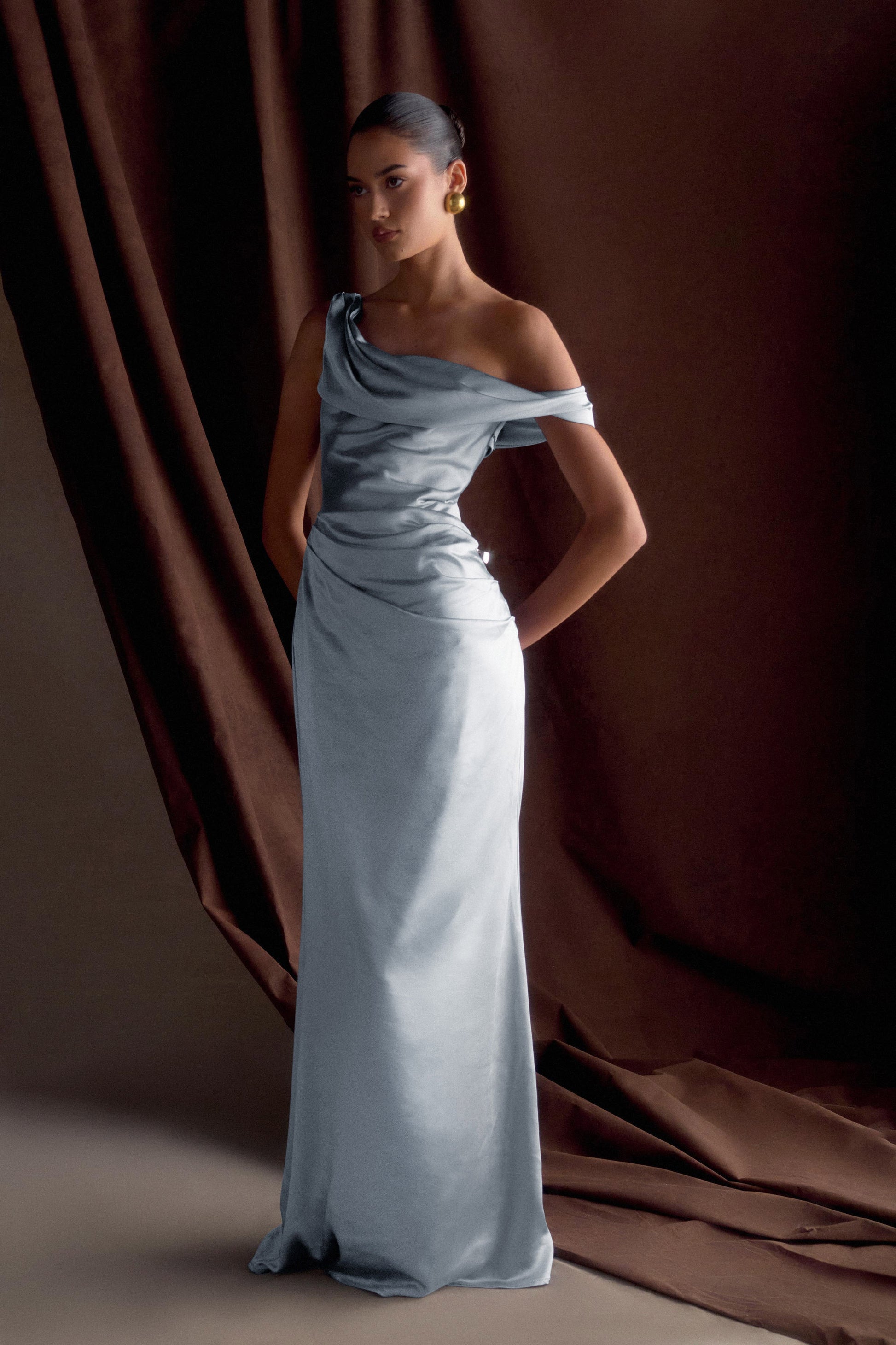 ROF Dalia Düşük Omuz Saten Maxi Elbise - Buzlu Mavi