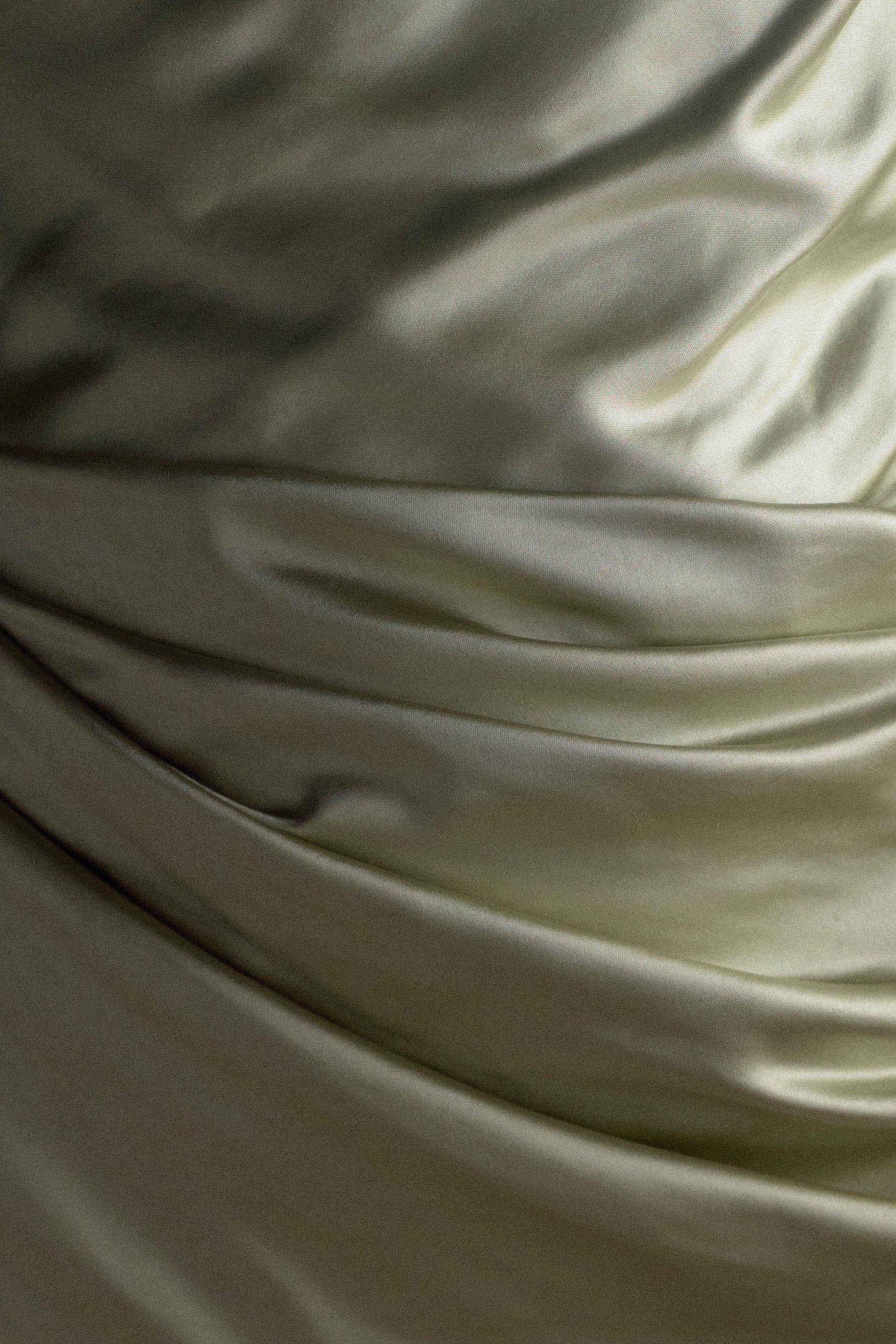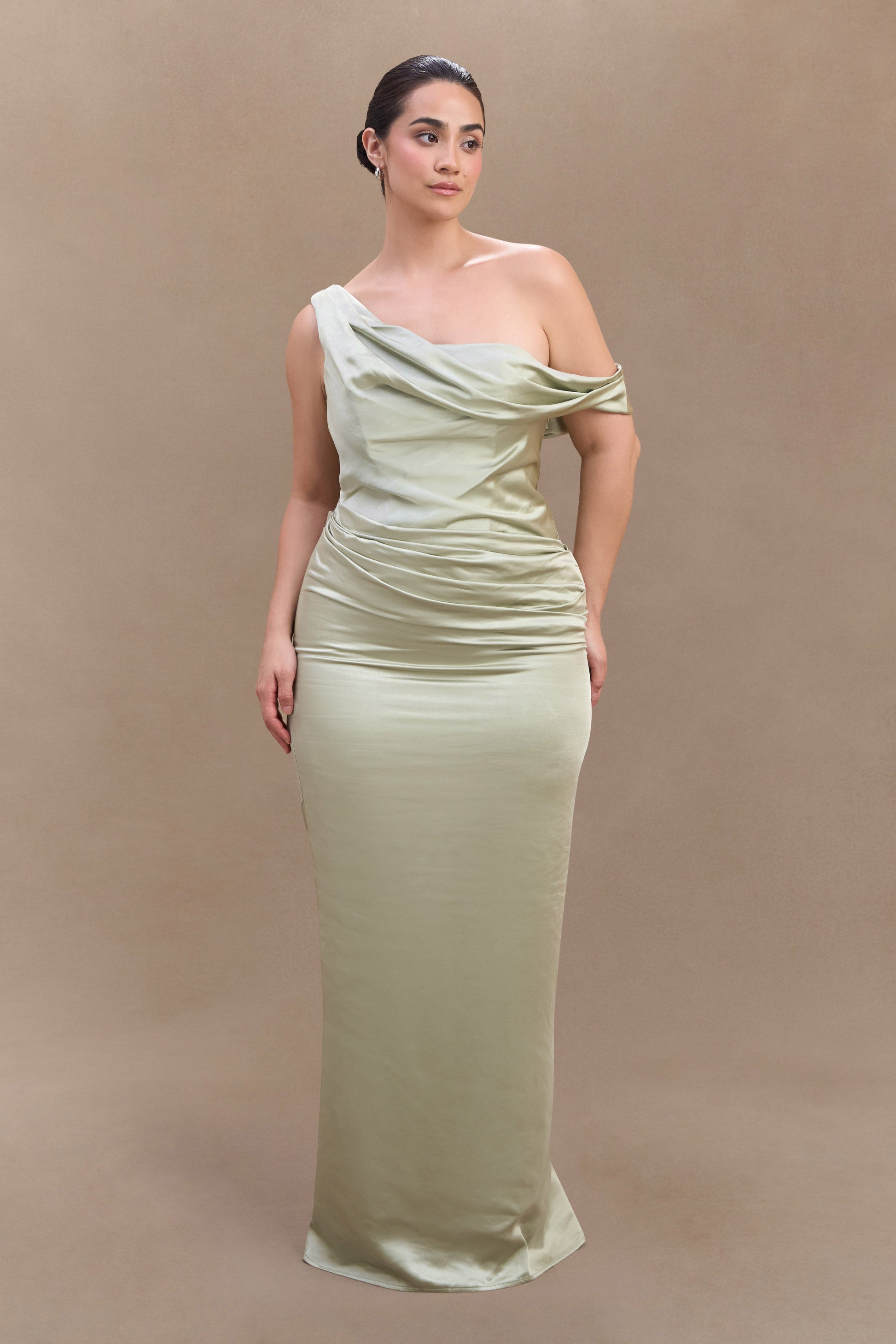 ROF Dalia Düşük Omuzlu Saten Maxi Elbise - Adaçayı
